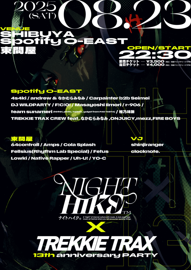 8月23日(土)深夜開催に、ネット音楽レーベルである「TREKKIE TRAX」の13周年のアニバーサリーイベントとコラボする『NIGHT HIKE × TREKKIE TRAX 13th Anniversary』を開催いたします。